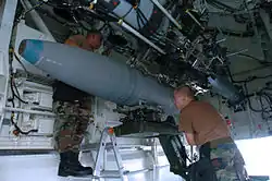 A 2,000 lb (910 kg) BDU-56 bomb being loaded onto a bomb bay's rotary launcher, 2004