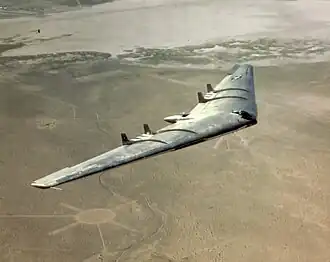 The Northrop YB-49 was an American prototype jet-powered heavy bomber developed by Northrop Corporation shortly after World War II for service with the United States Air Force.[1] The YB-49 featured a flying wing design and was a turbojet-powered development of the earlier, piston-engined Northrop XB-35 and YB-35. The two YB-49s built were both converted YB-35 test aircraft.