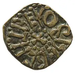 When coinage (as opposed to bartering) regained popularity in the late 600s, Northumbrian coins featured kings' names, indicating royal control of currency. Royal currency was unique in Britain for a long time. King Aldfrith (685–705) minted Northumbria's earliest silver coins, likely in York. Later royal coinage bears the name of King Eadberht (738–758), as well as his brother, Archbishop Ecgbert of York.[125] These coins were primarily small silver sceattas, more suitable to small, everyday transactions than larger gold Frankish or Roman coins.[126] During the reign of King Eanred the silver content of the coins declined until they were produced in copper alloy, these coins are commonly known as stycas, but the term is an antiquarian invention.[127] Stycas remains in use throughout the kingdom until at least the 860s and possibly later.[128] Larger bullion values can be seen in the silver ingots found in the Bedale Hoard, along with sword fittings and necklaces in gold and silver.[129]