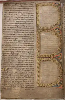 Insular art, rich in symbolism and meaning, is characterised by its concern for geometric design rather than naturalistic representation, love of flat areas of colour, and use of complicated interlace patterns.[101] All of these elements appear in the Lindisfarne Gospels (early eighth century). The Insular style was eventually imported to the European continent, exercising great influence on the art of the Carolingian empire.[102]