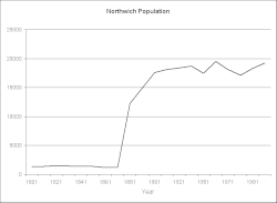 - ^ The totals shown are for Northwich township (1801–1871), Northwich Local Board (1881–1891), Northwich Urban District (1901–1971) and Northwich Civil Parish (1981–2001). There were changes to the boundaries of these areas in 1873, 1936 and 1955, which affected the subsequent census figures