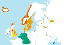 The economic and political dominance of the Hanseatic League between 1250 and 1450 in the main Scandinavian cities brought large Middle Low German–speaking populations to Norway. The influence of their language on Scandinavian is comparable with that of French on English after the Norman conquest.[5]