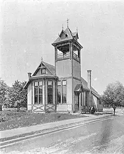 A small Central School schoolhouse was erected in 1887 to meet the education demands of the growing village. A one-room school house for Columbia Township had existed at this location possibly as early as 1828.[21] Just one year after construction, the 1887 school house was expanded, as the number of students enrolled had already doubled.[20]