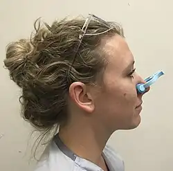Traditionally, nasal packing was accomplished by packing gauze into the nose, thereby placing pressure on the vessels in the nose and stopping the bleeding. Traditional gauze packing has been replaced with other non-dissolvable nasal packing products such as Merocel and the Rapid Rhino.[25] The Merocel nasal tampon is similar to gauze packing except it is a synthetic foam polymer (made of polyvinyl alcohol and expands in the nose after application of water) that provides a less hospitable medium for bacteria.[4] The Rapid Rhino stops nosebleeds using a balloon catheter, made of carboxymethylcellulose, which has a cuff that is inflated by air to stop bleeding through extra pressure in the nasal cavity.[25] Systematic review articles have demonstrated that the efficacy in stopping nosebleeds is similar between the Rapid Rhino and Merocel packs; however, the Rapid Rhino has been shown to have greater ease of insertion and reduced discomfort.[25] Posterior nasal packing can be achieved by using a Foley catheter, blowing up the balloon when it is in the back of the throat, and applying anterior traction so that the inflated balloon occludes the choanae.[26] Patients who receive non-dissolvable nasal packing need to return to a medical professional in 24–72 hours in order to have packing removed.[4][3] Complications of non-dissolvable nasal packing include abscesses, septal hematomas, sinusitis, and pressure necrosis.[2] In rare cases toxic shock syndrome can occur with prolonged nasal packing. As a result, any patient who has non-dissolvable nasal packing should be given prophylactic antibiotic medication to be taken as long as the nasal packing remains in the nose.[2]