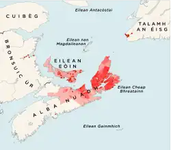 Nova Scotia is Latin for 'New Scotland' and is the recognized Canadian English name for the province.[12] Just prior to receiving this name, it was referred to as Nova Francia. Nova Scotia also appears on some older maps as New Caledonia.[13] In both Canadian French and Canadian Gaelic, the province is directly translated as 'New Scotland' (French: Nouvelle-Écosse; Gaelic: Alba Nuadh). In general, Romance and Slavic languages use translations of 'New Scotland' to their language, while most other languages use transliterations of the Latin (which is the same as English) name, including the native language Mi'kmaq (No’pa Sko’sia).[14]
