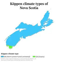 - ^ a b c "The Climate of Nova Scotia". The Climates of Canada. Environment Canada. Archived from the original on 19 April 2010. Retrieved 7 June 2015.
