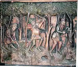By 1156, Novgorod had won the right to choose its own bishop.[43][10] In 1165, the bishop was elevated to archiepiscopal status.[50] The election of the bishop was carried out by the veche, and thus, Novgorod had an almost independent religious administration, which allowed it to enter its golden age.[43][51] The chronicles describe the first election of the bishop of Novgorod by the veche:[52]