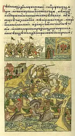 According to Russian sources,[68] during the Northern Crusades, the Novgorodian prince Alexander Yaroslavich defeated the Swedes at the Battle of the Neva in July 1240, from which he received the sobriquet Nevsky ("of the Neva").[69][70] Alexander then defeated German crusaders at the Battle on the Ice in 1242,[71] after the forces of the exiled prince of Pskov and men from the Bishopric of Dorpat attacked Pskov Land and Votia, a tributary of Novgorod.[72][73] This later led to him being depicted as an ideal ruler in chronicles such as the Life of Alexander Nevsky.[74] Novgorod was also spared by the Mongol armies during the Mongol invasions after Alexander Nevsky agreed to pay tribute.[75] Historians such as J. L. I. Fennell have called the proportions of Nevsky's victories as having been overblown; he also argued that there was no existence of a unified Western scheme of aggression against Russia and that Nevsky appeased the Mongols, while many Russian historians have argued that Nevsky was being wise, with cooperation with the Mongols being the only sensible option at the time which averted further tragedy.[76]