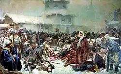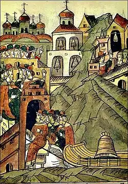 Some Novgorodian boyars were opposed to Moscow as a result, while others pursued a pro-Muscovite policy in the hopes that good relations with Moscow would reduce disruption in Novgorod's trade; Novgorod was also dependent on the Russian lands to its southwest for important imports such as grain.[82] Some Novgorodians were also attracted to Moscow due to it being the center of Russian Orthodoxy as opposed to Lithuania, where Catholicism was dominant and its culture was being increasingly polonized, though some Novgorodian clergy adopted a pro-Lithuanian policy for political reasons due to fears that embracing the grand prince of Moscow would eventually lead to the end of Novgorod's independence.[82] Most Novgorodian boyars had hoped to maintain the republic's independence since if Novgorod were to be conquered, the boyars' wealth would flow to the grand prince and Muscovite boyars, and the Novgorodians would fall into decline; most of them also did not earn enough to pay for war.[83]