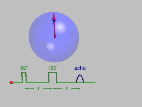 A Hahn echo decay experiment can be used to measure the dephasing time, as shown in the animation. The size of the echo is recorded for different spacings of the two pulses. This reveals the decoherence that is not refocused by the 180° pulse. In simple cases, an exponential decay is measured which is described by the T2 time.