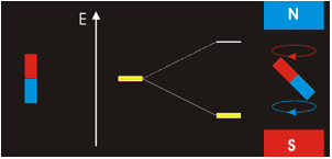 An intuitive model. Nuclei with spin have magnetic moments (spin magnetic moments). By itself, there is no energetic difference for any particular orientation of the nuclear magnet (only one energy state, on the left), but in an external magnetic field there is a high-energy state and a low-energy state depending on the relative orientation of the magnet to the external field, and in thermal equilibrium, the low-energy orientation is preferred. The average orientation of the magnetic moment will precess around the field. The external field can be supplied by a large magnet and also by electrons and other nuclei in the vicinity.