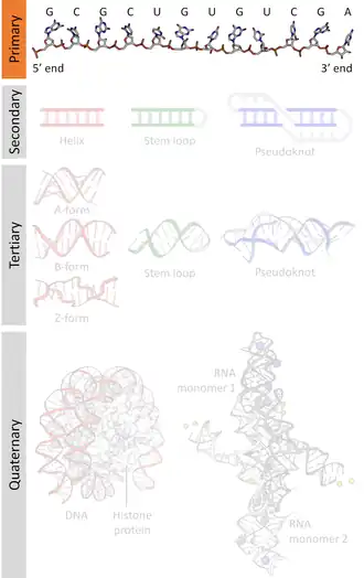 Nucleic acids also have a secondary structure and tertiary structure. Primary structure is sometimes mistakenly referred to as "primary sequence". However there is no parallel concept of secondary or tertiary sequence.