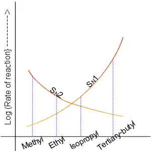 A graph showing the relative reactivities of the different alkyl halides towards SN1 and SN2 reactions (also see Table 1).