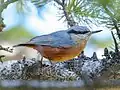 The Eurasian, chestnut-vented, Kashmir and chestnut-bellied nuthatches form another superspecies and replace each other geographically across Asia. They are currently considered to be four separate species, but the south Asian forms were once believed to be a subspecies of the Eurasian nuthatch.[15] A recent change in this taxonomy is a split of the chestnut-bellied nuthatch into three species, namely the Indian nuthatch, Sitta castanea, found south of the Ganges, the Burmese nuthatch, Sitta neglecta, found in southeast Asia, and the chestnut-bellied nuthatch sensu stricto, S. cinnamoventris, which occurs in the Himalayas.[16] Mitochondrial DNA studies have demonstrated that the white-breasted northern subspecies of Eurasian nuthatch, S. (europea) arctica, is distinctive,[17] and also a possible candidate for full species status.[18] This split has been accepted by the British Ornithologists' Union.[19]