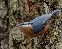 The nuthatches (/ˈnʌthætʃ/) constitute a genus, Sitta, of small passerine birds belonging to the family Sittidae. Characterised by large heads, short tails, and powerful bills and feet, nuthatches advertise their territory using loud, simple songs. Most species exhibit grey or bluish upper parts and a black eye stripe.