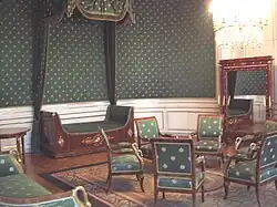 North of the Stone Hall, there is the wood-panelled antechamber, the audience chamber decorated with Brussels tapestries and the former bedroom with the so-called Little Beauty Gallery with the ladies of Versailles; all rooms were remodelled under Maximilian II Emanuel in the style of the Régence but retain their original Baroque ceilings. Here are on display portraits of the elector and his wife Theresa Kunegunda Sobieska. The bedroom closes the park side, next to it is the Drechsel Cabinet (turnery cabinet) of Maximilian III Joseph, designed by François de Cuvilliés. Three rooms further to the north were created under Charles Theodore with the widening of the gallery wing. In the first room there are now more portraits of ladies from the Great Gallery of Beauties of Max Emanuel, the second one is decorated with a pile rug with the coats of arms of Bavaria and the Palatinate (known as "coat of arms room"), while the third room contains portraits of Charles Theodore and both his consorts Elisabeth Auguste and Maria Leopoldine.[3]
