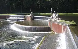 The garden parterre is still a visible feature of the French garden. As part of the transformation of the entire castle grounds by Sckell it was simplified, but retained its original size. The "Grand Cascade" was built by Joseph Effner in 1717. He was referring to a concept of François Roëttiers. The water falls in the middle of a two-part water staircase, the first stage being half round to the west, the second, deeper, is formed to the east. The cascade consists of symmetry which continues through the centre channel. The right side of the cataract was covered with pink marble in 1770. Originally a supporting architecture was to be provided, which was never executed. Instead, from 1775 to 1785, sculptures were added. Many were the work of Dominik Auliczek and Roman Anton Boos, who later added twelve decorative marble vases with mythological themes.