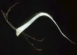The oarfish is a large and extremely long pelagic lampriform fish belonging to the small family Regalecidae.[1] Found in areas spanning from temperate ocean zones to tropical ones, yet rarely seen by humans, the oarfish family contains three species in two genera.[2] One of these, the giant oarfish (Regalecus glesne), is the longest bony fish alive, growing up to about 8 m (26 ft) in length.[3]