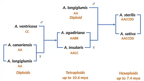 Analysis of maternal lineages of 25 Avena species using chloroplast and mitochondrial DNA showed that A. sativa's hexaploid genome derives from three diploid oat species (each with two sets of chromosomes); the sets are dubbed A, B, C, and D. The diploid species are the CC A. ventricosa, the AA A. canariensis, and the AA A. longiglumis, along with two tetraploid oats (each with four sets), namely the AACC A. insularis and the AABB A. agadiriana. Tetraploids were formed as much as 10.6 mya, and hexaploids as much as 7.4 mya.[7]