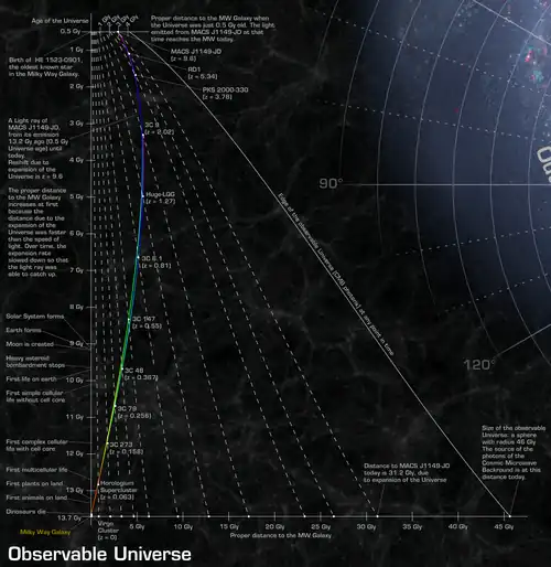 The space before this cosmic event horizon can be called "reachable universe", that is all galaxies closer than that could be reached if we left for them today, at the speed of light; all galaxies beyond that are unreachable.[19][20] Simple observation will show the future visibility limit (62 billion light-years) is exactly equal to the reachable limit (16 billion light-years) added to the current visibility limit (46 billion light-years).[21][7]