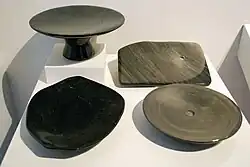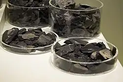 The first known archaeological evidence of usage was in Kariandusi (Kenya) and other sites of the Acheulian age (beginning 1.5 million years BP) dated 700,000 BC, although only very few objects have been found at these sites relative to the Neolithic.[37][38][39][40][41] Manufacture of obsidian bladelets at Lipari had reached a high level of sophistication by the late Neolithic, and was traded as far as Sicily, the southern Po river valley, and Croatia.[42] Obsidian bladelets were used in ritual circumcisions and cutting of umbilical cords of newborns.[43] Anatolian sources of obsidian are known to have been the material used in the Levant and modern-day Iraqi Kurdistan from a time beginning sometime about 12,500 BC.[44] Obsidian artifacts are common at Tell Brak, one of the earliest Mesopotamian urban centers, dating to the late fifth millennium BC.[45] Obsidian was valued in Stone Age cultures because, like flint, it could be fractured to produce sharp blades or arrowheads in a process called knapping. Like all glass and some other naturally occurring rocks, obsidian breaks with a characteristic conchoidal fracture. It was also polished to create early mirrors. Modern archaeologists have developed a relative dating system, obsidian hydration dating, to calculate the age of obsidian artifacts.