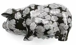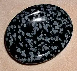 Pure obsidian is usually dark in appearance, though the color varies depending on the impurities present. Iron and other transition elements may give the obsidian a dark brown to black color. Most black obsidians contain nanoinclusions of magnetite, an iron oxide.[25] Very few samples of obsidian are nearly colorless. In some stones, the inclusion of small, white, radially clustered crystals (spherulites) of the mineral cristobalite in the black glass produce a blotchy or snowflake pattern (snowflake obsidian). Obsidian may contain patterns of gas bubbles remaining from the lava flow, aligned along layers created as the molten rock was flowing before being cooled. These bubbles can produce interesting effects such as a golden sheen (sheen obsidian). An iridescent, rainbow-like sheen (fire obsidian) is caused by inclusions of magnetite nanoparticles creating thin-film interference.[26] Colorful, striped obsidian (rainbow obsidian) from Mexico contains oriented nanorods of hedenbergite, which cause the rainbow striping effects by thin-film interference.[25]