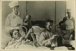 Occupational therapy during WWI: bedridden wounded are knitting.