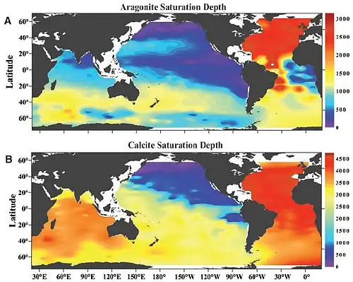 Distribution of (A) aragonite and (B) calcite saturation depth in the global oceans[39]