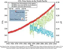 Time series of atmospheric CO2 at Mauna Loa (in parts per million volume, ppmv; red), surface ocean pCO2 (μatm; green) and surface ocean pH (blue) at Ocean Station ALOHA in the subtropical North Pacific Ocean[48][49]