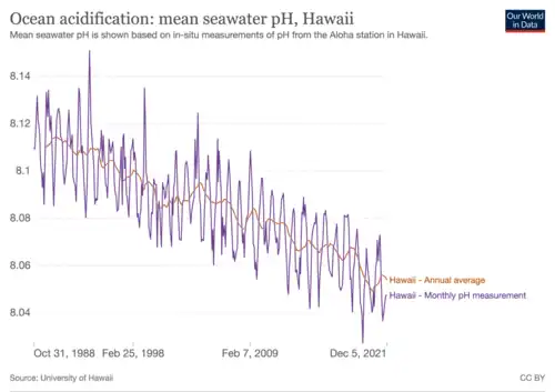 Ocean acidification means that the average seawater pH value is dropping over time.[1]