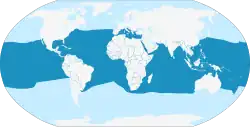 This shark is found worldwide between 45°N and 43°S latitude. It lives in deep, open oceans, with a temperature greater than 18 °C (64 °F),[3] It prefers water temperatures above 20 °C (68 °F), and up to 28 °C (82 °F) but can also be found in waters as cool as 15 °C (59 °F) but avoids temperatures lower than this.[6][8] It was once extremely common and widely distributed, and still inhabits a wide band around the globe; however, recent studies suggest that its numbers have drastically declined.[9]