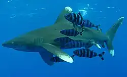 The species feeds mainly on pelagic cephalopods, like squid, and bony fish,[3] such as lancetfish, threadfins, oarfish, barracuda, jacks, mahi-mahi, marlin, tuna, and mackerel. However, its diet can be far more varied and less selective—it is known to eat stingrays, sea turtles, seabirds, gastropods, crustaceans, and marine mammal carcasses. Its feeding methods include swimming through schools of frenzied tuna with an open mouth, waiting for the fish to swim in before biting down; when whaling formerly took place in warm waters, oceanic whitetips were the most common scavengers of floating carcasses, which may explain why they are sometimes considered one of the "whaler sharks". Whitetips commonly compete for food with silky sharks, explaining its comparatively leisurely swimming style combined with aggressive displays.[6] They are known to trail pilot whales as they both feed on squid.[4][14] Evidence in the form of sucker scars on the skin of an individual filmed off Hawaii indicate that the species may also dive deep enough to battle with large squid, such as the giant squid.[15]