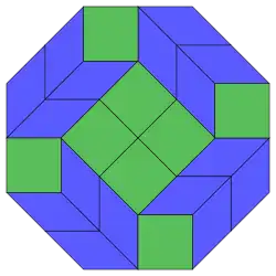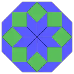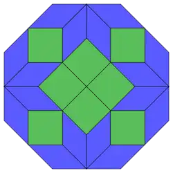 Coxeter states that every zonogon (a 2m-gon whose opposite sides are parallel and of equal length) can be dissected into m(m-1)/2 parallelograms.[5] In particular this is true for regular polygons with evenly many sides, in which case the parallelograms are all rhombi. For the regular octagon, m=4, and it can be divided into 6 rhombs, with one example shown below. This decomposition can be seen as 6 of 24 faces in a Petrie polygon projection plane of the tesseract. The list (sequence A006245 in the OEIS) defines the number of solutions as eight, by the eight orientations of this one dissection. These squares and rhombs are used in the Ammann–Beenker tilings.