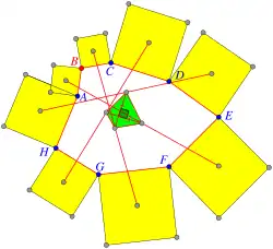The midpoint octagon of a reference octagon has its eight vertices at the midpoints of the sides of the reference octagon. If squares are constructed all internally or all externally on the sides of the midpoint octagon, then the midpoints of the segments connecting the centers of opposite squares themselves form the vertices of a square.[2]: Prop. 10
