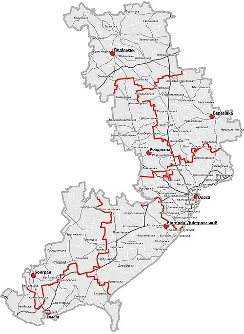 • Note: A caret (^) indicates the two municipalities and nine raions which previously constituted Izmail Oblast until that former oblast's merger with Odesa Oblast on 15 February 1954; these areas lie to the west of the Dniester River, and formerly constituted the territory known as the Budjak (southern Bessarabia). In the 18 July 2020 reorganisation, these nine raions were reduced to three, which also incorporated the two former independent cities.