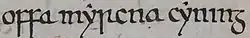 The title Offa used on most of his charters was "rex Merciorium", or "king of the Mercians", though this was occasionally extended to "king of the Mercians and surrounding nations".[123] Some of his charters use the title "Rex Anglorum", or "King of the English", and this has been seen as a sweeping statement of his power. There is debate on this point, however, as several of the charters in which Offa is named "Rex Anglorum" are of doubtful authenticity. They may represent later forgeries of the 10th century, when this title was standard for kings of England.[69] The best evidence for Offa's use of this title comes from coins, not charters: there are some pennies with "Of ℞ A" inscribed, but it is not regarded as definite that this stood for "Offa Rex Anglorum".[113]