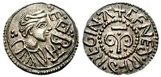 The medium-weight coins often carry designs of high artistic quality, exceeding that of the contemporary Frankish currency.[111] Coin portraits of Offa have been described as "showing a delicacy of execution which is unique in the whole history of the Anglo-Saxon coinage".[83] The depictions of Offa on the coins include a "striking and elegant" portrait showing him with his hair in voluminous curls, and another where he wears a fringe and tight curls. Some coins show him wearing a necklace with a pendant. The variety of these depictions implies that Offa's die-cutters were able to draw on varied artistic sources for their inspiration.[114]