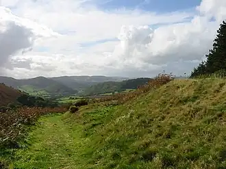 The best known relic associated with Offa's time is Offa's Dyke, a great earthen barrier that runs approximately along the border between England and Wales. It is mentioned by the monk Asser in his biography of Alfred the Great: "a certain vigorous king called Offa ... had a great dyke built between Wales and Mercia from sea to sea".[58] The dyke has not been dated by archaeological methods, but most historians find no reason to doubt Asser's attribution.[59] Early names for the dyke in both Welsh and English also support the attribution to Offa.[60] Despite Asser's comment that the dyke ran "from sea to sea", it is now thought that the original structure only covered about two-thirds of the length of the border: in the north it ends near Llanfynydd, less than five miles (8 km) from the coast, while in the south it stops at Rushock Hill, near Kington in Herefordshire, less than fifty miles (80 km) from the Bristol Channel. The total length of this section is about 64 miles (103 km).[59] Other earthworks exist along the Welsh border, of which Wat's Dyke is one of the largest, but it is not possible to date them relative to each other and so it cannot be determined whether Offa's Dyke was a copy of or the inspiration for Wat's Dyke.[61]