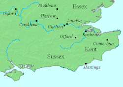 The evidence for Offa's involvement in the kingdom of Sussex comes from charters, and as with Kent there is no clear consensus among historians on the course of events. What little evidence survives that bears on Sussex's kings indicates that several kings ruled at once, and it may never have formed a single kingdom. It has been argued that Offa's authority was recognised early in his reign by local kings in western Sussex, but that eastern Sussex (the area around Hastings) submitted to him less readily. Symeon of Durham, a twelfth-century chronicler, records that in 771 Offa defeated "the people of Hastings", which may record the extension of Offa's dominion over the entire kingdom.[40] However, doubts have been expressed about the authenticity of the charters which support this version of events, and it is possible that Offa's direct involvement in Sussex was limited to a short period around 770–71. After 772, there is no further evidence of Mercian involvement in Sussex until c. 790, and it may be that Offa gained control of Sussex in the late 780s, as he did in Kent.[41]