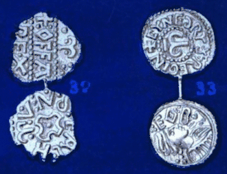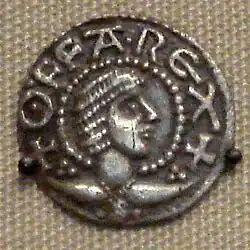 At the start of the 8th century, sceattas were the primary circulating coinage. These were small silver pennies, which often did not bear the name of either the moneyer or the king for whom they were produced. To contemporaries these were probably known as pennies, and are the coins referred to in the laws of Ine of Wessex.[108][109][110] This light coinage (in contrast to the heavier coins minted later in Offa's reign) can probably be dated to the late 760s and early 770s. A second, medium-weight coinage can be identified before the early 790s.[111] These new medium-weight coins were heavier, broader and thinner than the pennies they replaced,[108] and were prompted by the contemporary Carolingian currency reforms.[86] The new pennies almost invariably carried both Offa's name and the name of the moneyer from whose mint the coins came.[108] The reform in the coinage appears to have extended beyond Offa's own mints: the kings of East Anglia, Kent and Wessex all produced coins of the new heavier weight in this period.[112]