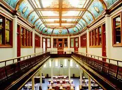 During the mid-19th century, Ohio Wesleyan focused on attracting students, adding fields of study, and fundraising, by which it significantly increased its endowment.[21] Sturges Hall was constructed as the university's first library in 1855.[22] In 1873, the school added the Department of Natural History housed in Merrick Hall.[23] The Ohio Wesleyan Female College, established in 1853, merged with the university in 1877.[24][25] Between 1876 and 1888, enrollment tripled and music education greatly increased, yet no major buildings were built in this time.[26][27]