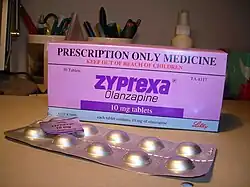Olanzapine, sold under the brand name Zyprexa among others, is an atypical antipsychotic primarily used to treat schizophrenia and bipolar disorder.[12] It is also sometimes used off-label for treatment of chemotherapy-induced nausea and vomiting[13] and as an appetite stimulant.[14] For schizophrenia, it can be used for both new-onset disease and long-term maintenance.[12] It is taken by mouth or by injection into a muscle.[12]