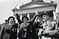 Lady Baden-Powell visiting Helsinki in 1960. To her left, Helvi Sipilä, to her right, Jarl Wahlström.