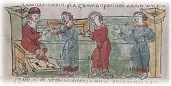 Miniature from the Radziwiłł Chronicle, late 15th century. Oleg (far left) is shown receiving tribute from the Severians