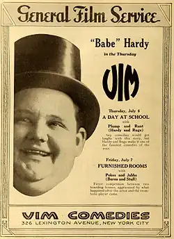 The next year, he made his first movie, Outwitting Dad (1914), for the Lubin studio, billed as O. N. Hardy. In his personal life, he was known as "Babe" Hardy and was billed as "Babe Hardy" in many of his later films at Lubin, such as Back to the Farm (1914). He was a big man, standing 6 feet 1 inch (1.85 m) and weighing up to 300 pounds (c. 136 kg), and his size placed limits on the roles that he could play. He was most often cast as the villain, but he also had roles in comedy shorts, his size complementing the character. By 1915, Hardy had made 50 short one-reel films at Lubin. He moved to New York and made films for the Pathé, Casino and Edison Studios. He returned to Jacksonville, where he made films for the Vim Comedy Company. That studio closed after Hardy discovered that the owners were stealing from the payroll.[6] He then worked for the King Bee studio, which bought Vim, and worked with Billy Ruge, Billy West (a Charlie Chaplin imitator), and comedic actress Ethel Burton. He continued playing the villains for West well into the early 1920s, often imitating Eric Campbell to West's Chaplin.