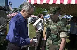 While at Brockport, North spent a summer at the United States Marine Corps Platoon Leaders Class at Marine Corps Base Quantico in Virginia, and gained an appointment to the United States Naval Academy in 1963. He received his commission as second lieutenant in 1968, having missed a year due to serious back and leg injuries from an auto accident in which a classmate was killed.[6] One of North's classmates at the academy was future secretary of the Navy and U.S. senator Jim Webb, whom he beat in a middleweight championship boxing match at Annapolis.[7] (North had shown films of this match to Marine Medical Corps officials to prove that he had fully recovered from his serious accident and could endure the rigors of midshipman training.[6]) Their graduating class included Dennis C. Blair, Michael Mullen, Jay L. Johnson, Charles Bolden and Michael Hagee.