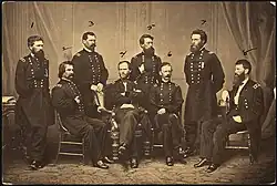 Major General William T. Sherman, Commanding Military Division of the Mississippi, and his Generals, 1. Maj. Gen. O. O. Howard; 2. Maj. Gen. John A. Logan; 3. Maj. Gen. William B. Hazen; 4. Maj. Gen. William T. Sherman; 5. Maj. Gen. Jefferson C. Davis; 6. Maj. Gen. Henry Warner Slocum; 7. Maj. Gen. Joseph A. Mower; 8. Maj. Gen. Francis P. Blair Jr. (possibly cut in)