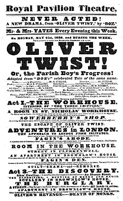 - In 1838 Charles Zachary Barnett's adaptation, the three-act burletta Oliver Twist; or, The Parish Boy's Progress opened at the Marylebone Theatre in London.[52]