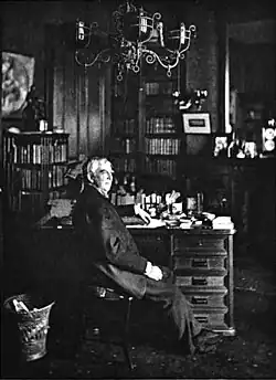 Holmes's fame continued through his later years. The Poet at the Breakfast-Table was published in 1872.[118] Written fifteen years after The Autocrat, this work's tone was mellower and more nostalgic than its predecessor's; "As people grow older," Holmes wrote, "they come at length to live so much in memory that they often think with a kind of pleasure of losing their dearest possessions. Nothing can be so perfect while we possess it as it will seem when remembered".[119] In 1876, at the age of seventy, Holmes published a biography of John Lothrop Motley, which was an extension of an earlier sketch he had written for the Massachusetts Historical Society Proceedings. The following year he published a collection of his medical essays and Pages from an Old Volume of Life, a collection of essays he had previously written for The Atlantic Monthly.[120] He was elected a member of the American Philosophical Society in 1880.[121] He retired from Harvard Medical School in 1882 after thirty-five years as a professor.[122] After he gave his final lecture on November 28, the university made him professor emeritus.[123]