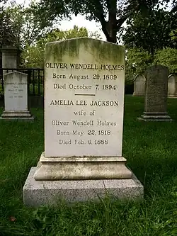 Holmes died quietly after falling asleep in the afternoon of Sunday, October 7, 1894.[136] His son Oliver Wendell Holmes Jr. wrote, "His death was as peaceful as one could wish for those one loves. He simply ceased to breathe."[137] Holmes's memorial service was held at King's Chapel and overseen by Edward Everett Hale. Holmes was buried alongside his wife in Mount Auburn Cemetery in Cambridge, Massachusetts.[138]